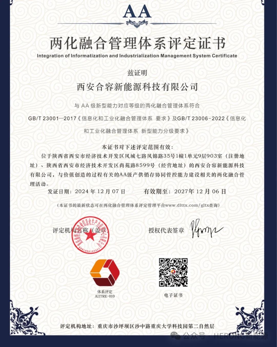 近日,西安合容新能源科技有限公司(以下簡稱“合容新能源”)順利通過國家工業和信息化部GB/T23001-2017《信息化和工業化融合管理體系要求》及GB/T23006-2022《信息化和工業化融合管理體系新型能力分級要求》體系認證,獲得AA兩化融合管理體系評定證書,標志著公司在信息化和工業化深度融合方面邁出了堅實的步伐。